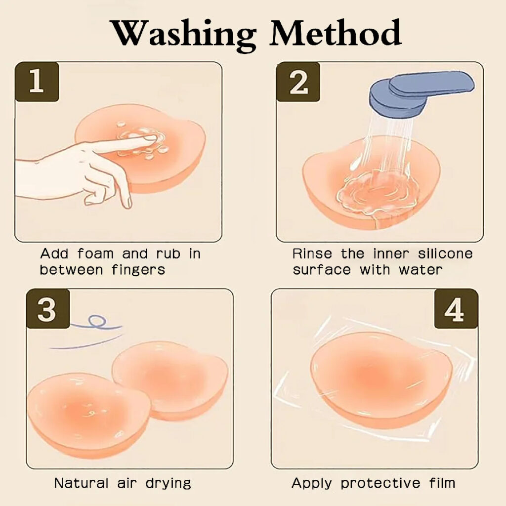 Our boobs lift inserts are made of silicon material that are easy to wash with water and the glue still stay sticky even after rewashing. Reuse for the 40+ times